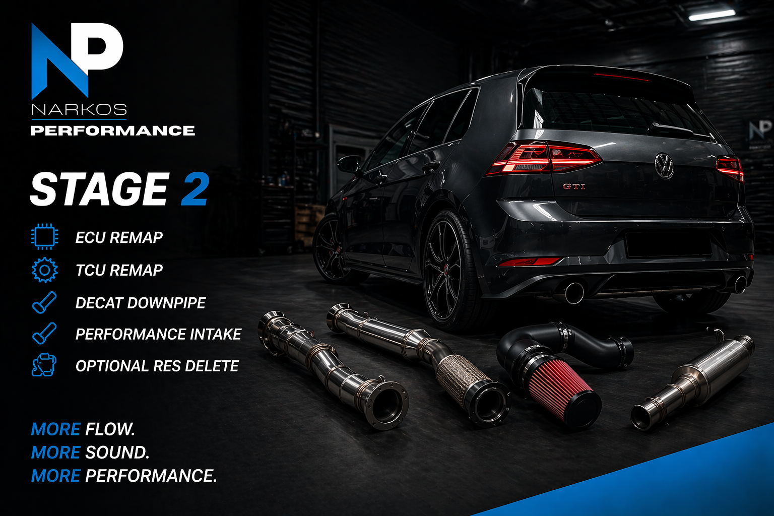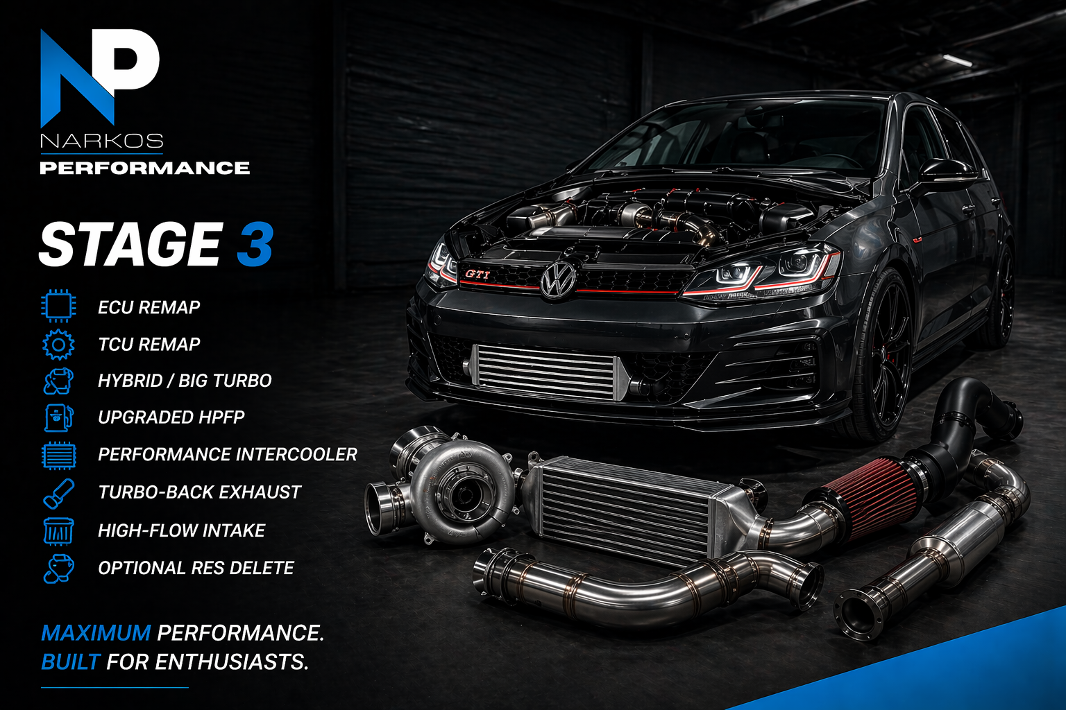 Built for maximum performance, Stage 3 transforms your GTI into a high-output machine. This package is designed for enthusiasts looking for serious power increases and track-capable performance.